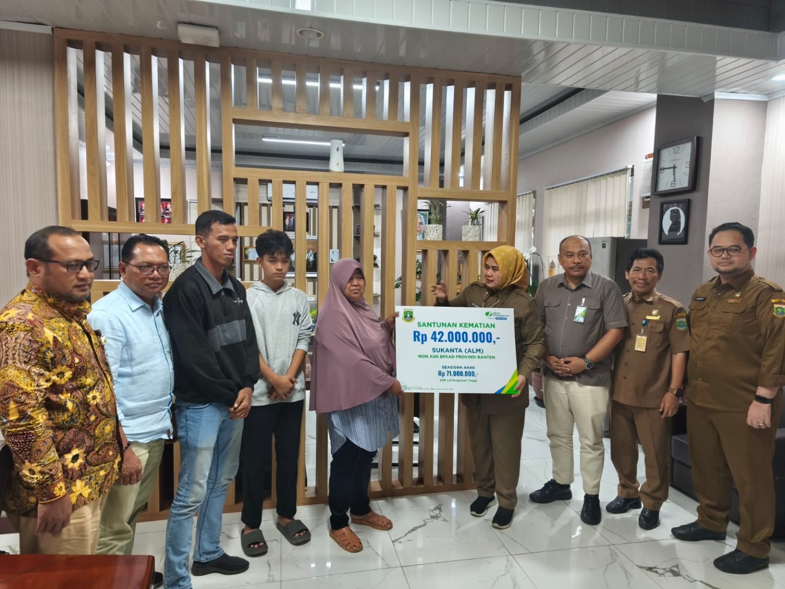 Kepala Badan Pengelola Keuangan dan Aset Daerah (BPKAD) Provinsi Banten Dr. Hj Rina Dewiyanti, SE, M.Si menyerahkan santunan Jaminan Kematian (JKM) BPJS Ketenagakerjaan kepada ahli waris Almarhum Sukanta.