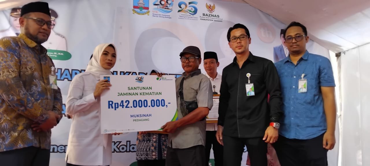 Penyerahan santunan dilakukan secara simbolis oleh Bupati Serang, Ratu Rachmatuzakiyah, didampingi Asisten Deputi Kepesertaan Bidang Korporasi BPJS Ketenagakerjaan, R. Chandra Budiman, Kepala Kantor BPJS Ketenagakerjaan Serang Raya, Uus Supriyadi, dan Kepala Kantor BPJS Ketenagakerjaan Serang Cikande, Muhammad Kautsar Abid dalam acara Milad ke-25 Baznas Kabupaten Serang yang dirangkaikan dengan peringatan Hari Jadi ke-499 Kabupaten Serang di Halaman Kantor Kecamatan Binuang.
