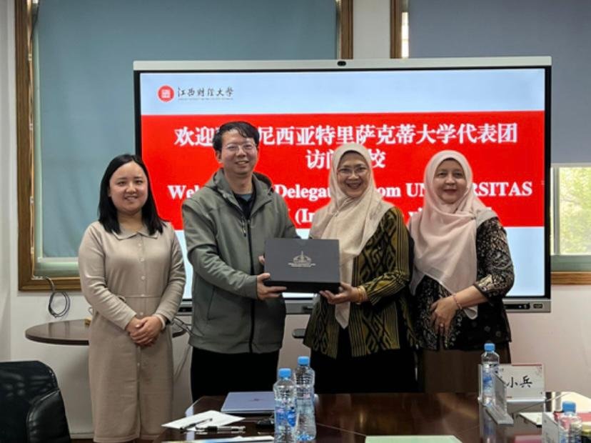 Penyerahan cendera mata dari Dekan FEB Universitas Trisakti, Prof. Dr. Yolanda Masnita (dua, kanan) kepada Vice Director of International Office Jiangxi University of Finance and Economics (JUFE), Liu Xiaobing (dua, kiri) pada 8 April 2026 (Foto: Istimewa)