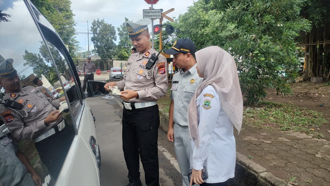 Serang, ( Gerbang Banten) – Dalam upaya meningkatkan keselamatan berlalu lintas dan memastikan kepatuhan Pajak Kendaraan Bermotor (PKB) serta Sumbangan Wajib Dana Kecelakaan Lalu Lintas Lalan (SWDKLLJ). Jasa Raharja bersama Bapenda Samsat Kota Serang dan Unit Lantas Polres Serang kembali menggelar operasi razia pada hari rabu tanggal 12 November 2025 di Jalan Raya Jendral Sudirman, tepatnya di depan stadion Maulauna Yusuf Kota Serang