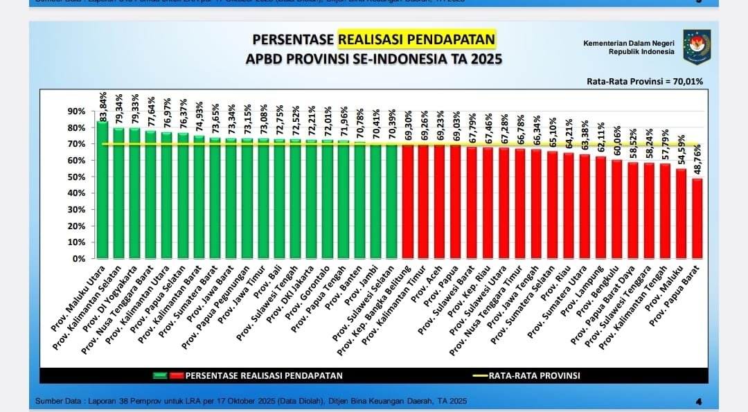 Data tersebut berdasarkan Direktorat Jenderal Bina Keuangan Daerah Kemendagri per 17 Oktober 2025. Secara nasional, rata-rata realisasi pendapatan APBD provinsi di Indonesia mencapai 70,01 persen, sedangkan rata-rata realisasi belanja sebesar 55,59 persen.