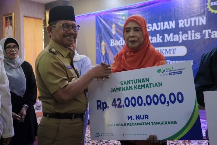 Santunan JKM senilai Rp42 juta per penerima diserahkan secara simbolis kepada ahli waris dan perwakilan penerima manfaat oleh Wali Kota Tangerang, H. Sachrudin. Penyerahan dilakukan dalam acara Pengajian Rutin Badan Kontak Majelis Taklim (BKMT) di Aula Kecamatan Tangerang, Selasa (23/09/2025).