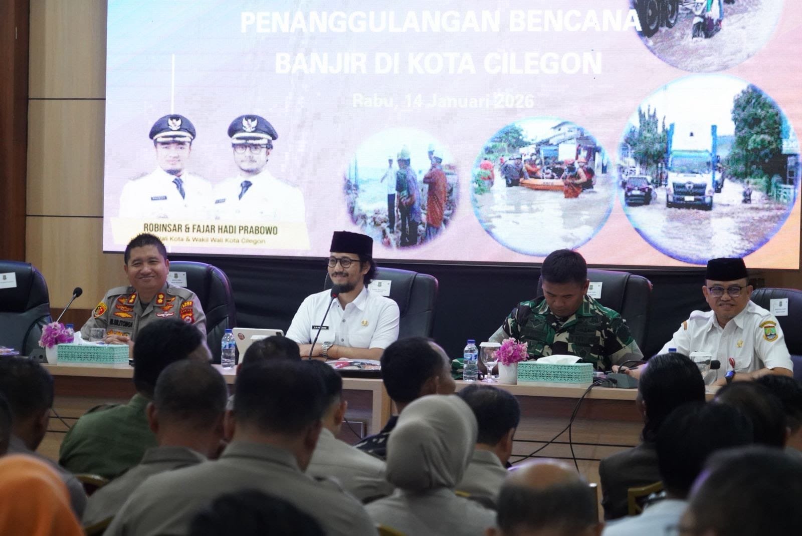 Wakil Wali Kota Cilegon, Fajar Hadi Prabowo, dalam arahannya menyampaikan permohonan maaf kepada masyarakat atas ketidaknyamanan yang ditimbulkan akibat bencana banjir. “Kami mewakili Pemerintah Kota Cilegon memknta maaf kepada masyarakat Kota Cilegon yang terdampak banjir, ini menjadi evaluasi kita kedepan agar banjir seperti ini bisa kita cegah,” ungkapnya.