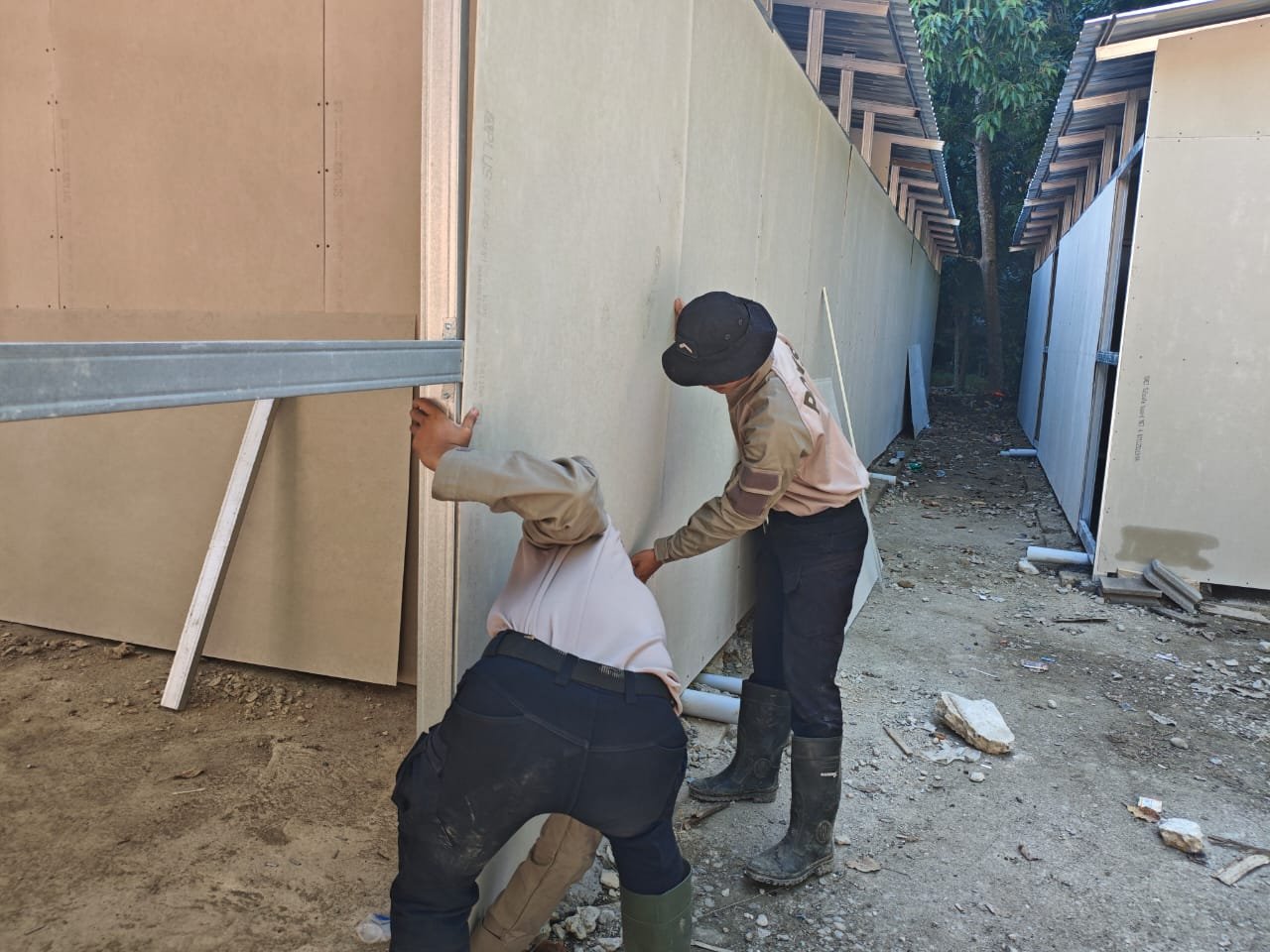 Adapun progres pekerjaan yang telah dilaksanakan hingga hari ini yaitu: pengecoran dasar rumah telah selesai dan siap digunakan pada 22 unit rumah. Kerangka baja ringan untuk tiang rumah juga telah terpasang pada 22 unit rumah. Pemasangan dinding GRC saat ini sedang berlangsung pada 22 unit rumah, bersamaan dengan pengerjaan teras untuk jumlah unit yang sama.