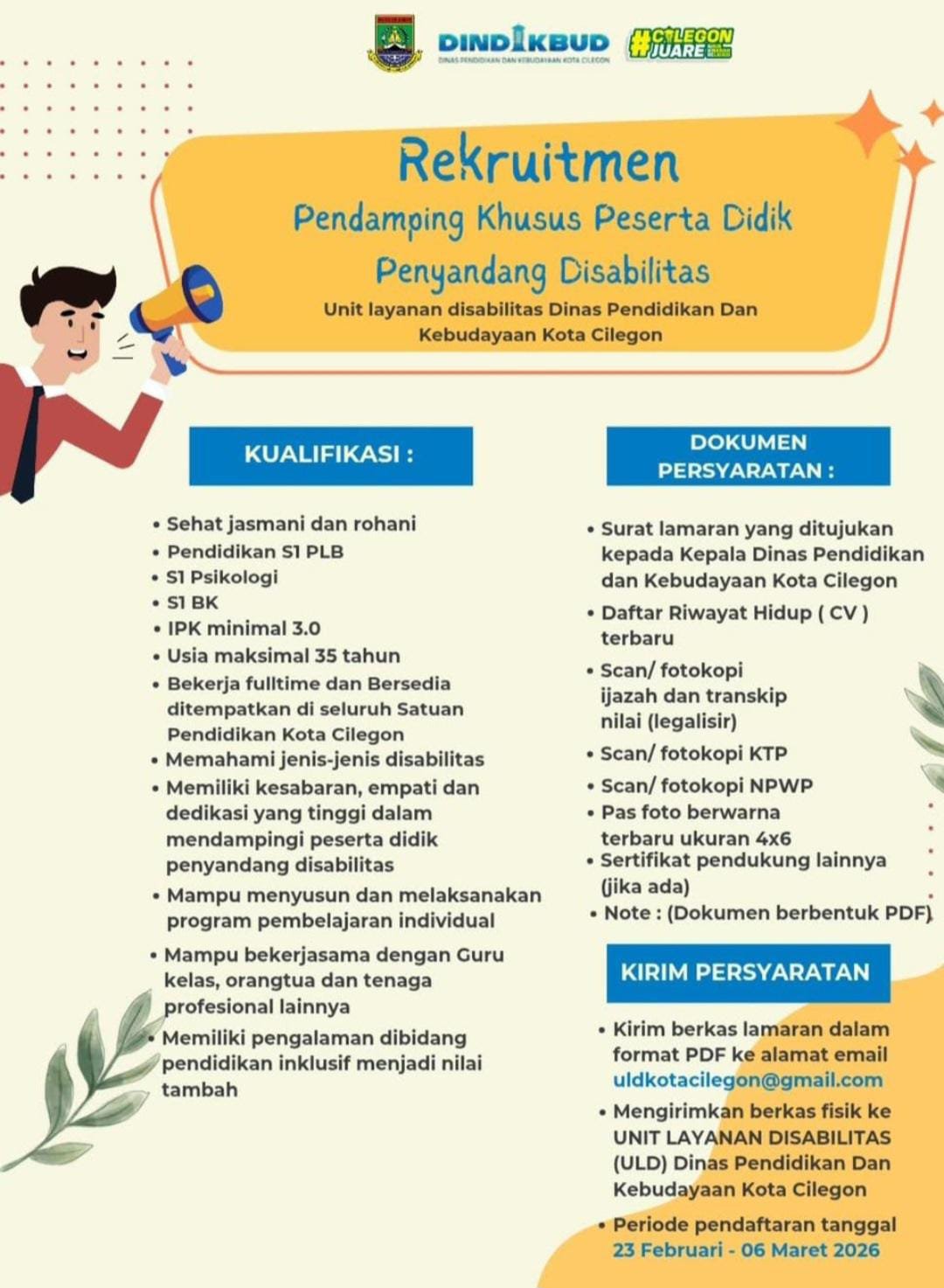 CILEGON, (gerbangbanten.com) – Pemerintah Kota Cilegon melalui Dinas Pendidikan dan Kebudayaan (Dindikbud) terus menunjukkan komitmennya dalam menghadirkan pendidikan inklusif yang berkualitas. Melalui Unit Layanan Disabilitas (ULD), Dindikbud resmi membuka rekrutmen tenaga layanan disabilitas tahun 2026 guna memperkuat pendampingan serta layanan profesional bagi peserta didik berkebutuhan khusus di seluruh satuan pendidikan Kota Cilegon.